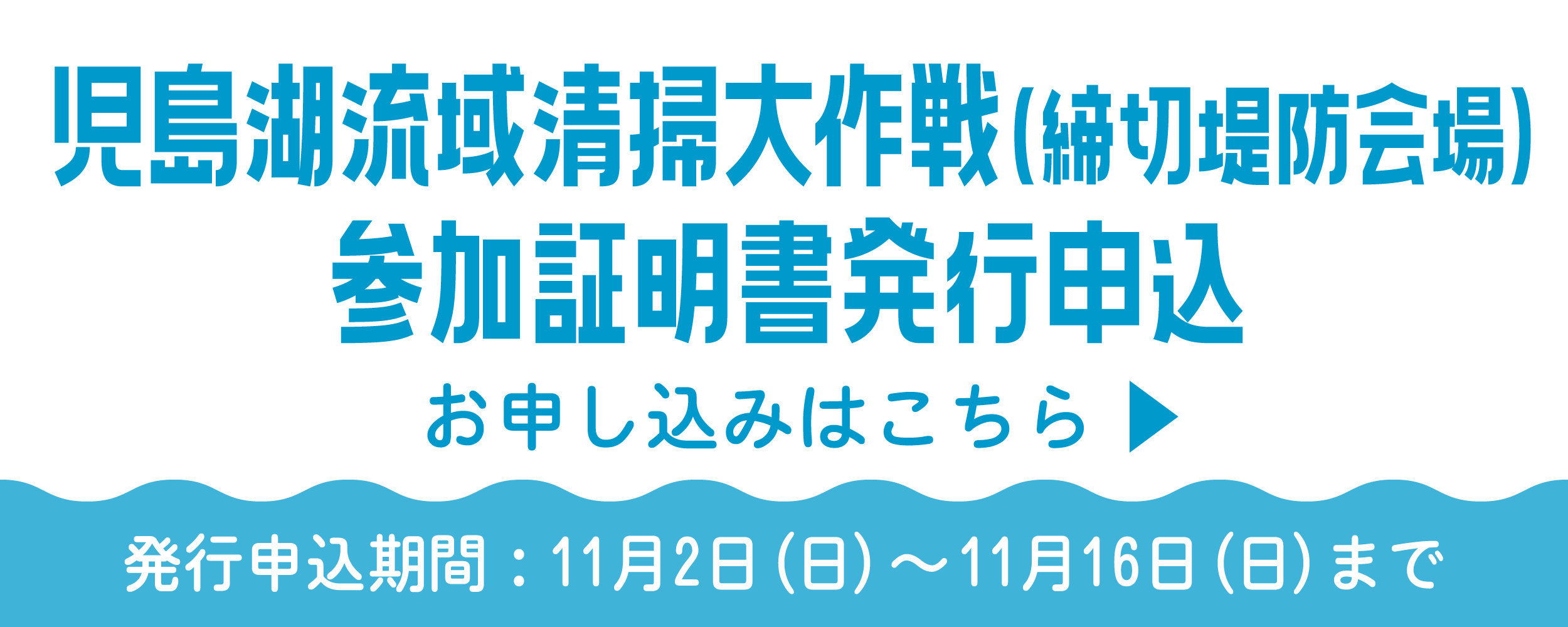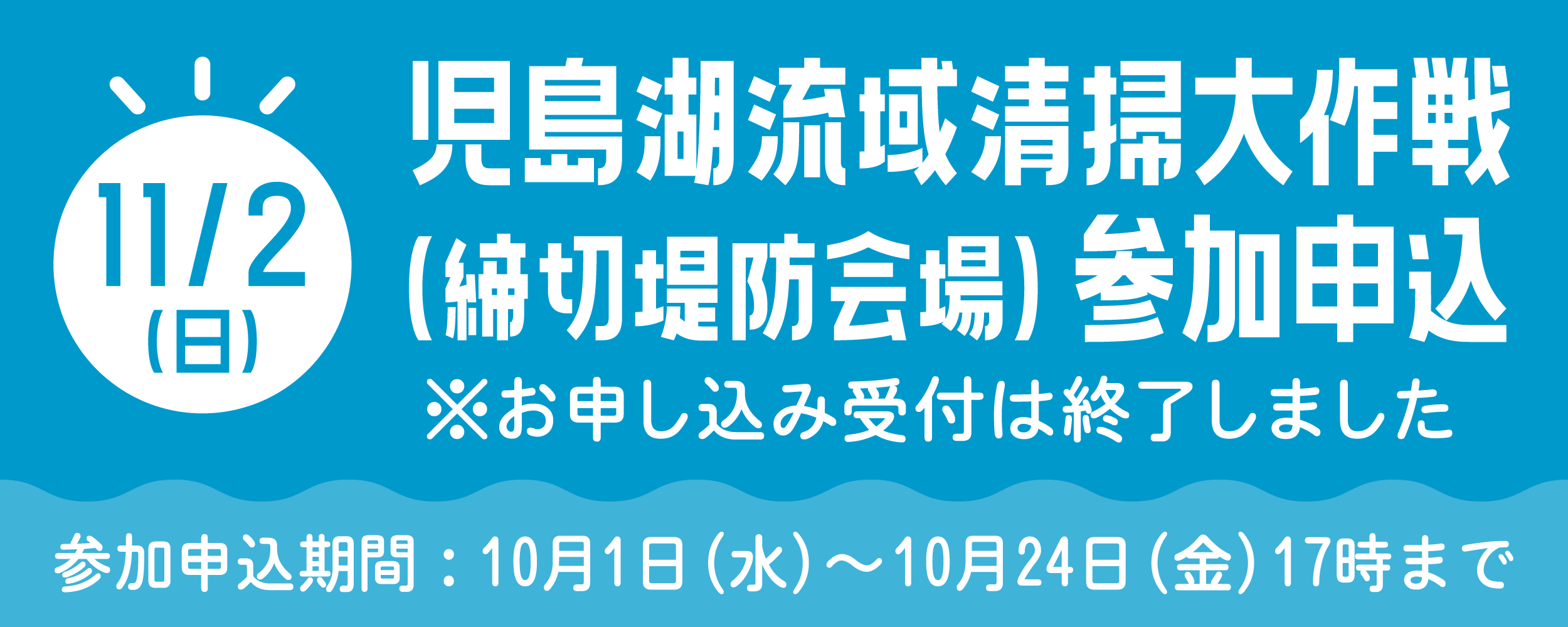 この期間の主要行事である「児島湖流域清掃大作戦」について、本年度は11月2日(日)に児島湖及び流域河川で実施予定ですが、岡山県が担当する『締切堤防会場』は事前申込が必要となりますので、締切堤防会場に参加を希望される方は、下記のバナーをクリックして申し込みをお願いします。