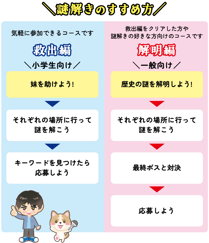 1か所につき2種類(小学生向け・一般向け)の難易度の謎を用意しています。